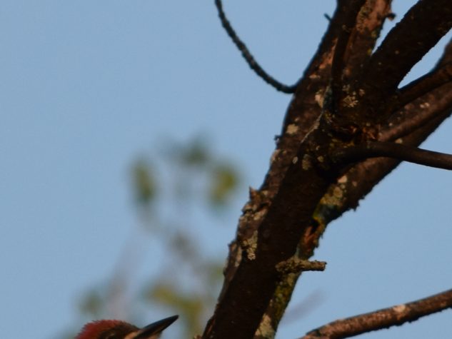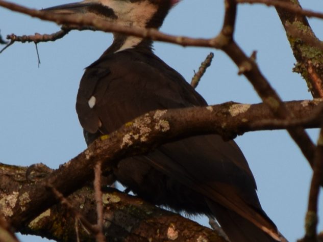 La joie d’avoir vu pour la première fois un Grand Pic! Cette femelle est passée juste à côté de moi à la hauteur des yeux. Je suis restée immobile! Et elle s’est agrippée à cet arbre à la recherche d’insectes.