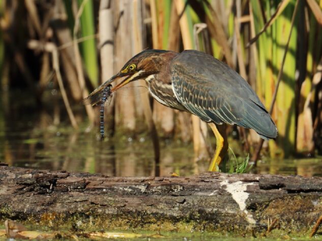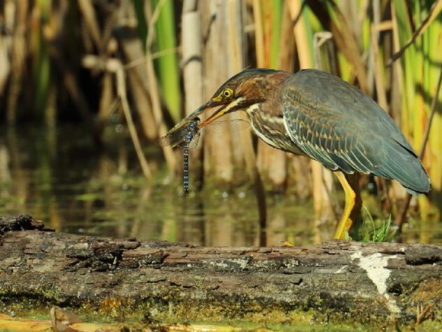 Héron vert pris au Marais Provancher à Neuville, le 27 août 2021 dans un moment de bagarre avec un juvénile, ils se relançaient chacun leur tour. Ici je montre l’adulte seul qui a les plumes toutes gonflées et surveille le juvénile devant lui et pousse des cris… Je me suis demandé si c’était sérieux ou tout simplement l’adulte veut montrer au jeune comment se défendre…