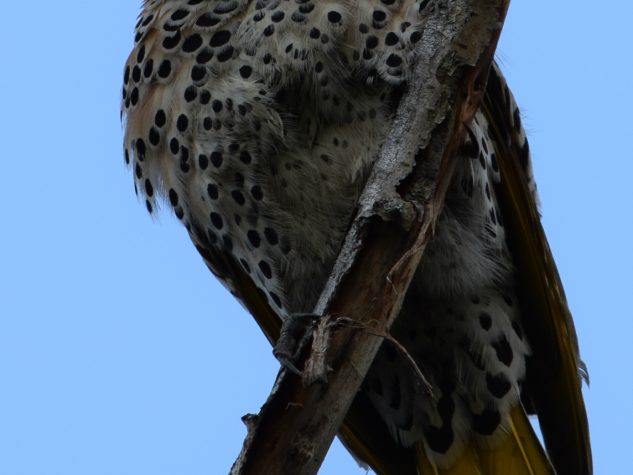 Oui, c’est spécial en effet. Normalement, les rachis des plumes et le dessous des plumes de vol et de queue sont jaunes. Chez les Pics flamboyants de l’ouest du pays c’est orangé plutôt que jaune. Celui-ci présente les deux teintes, c’est intéressant. 🙂