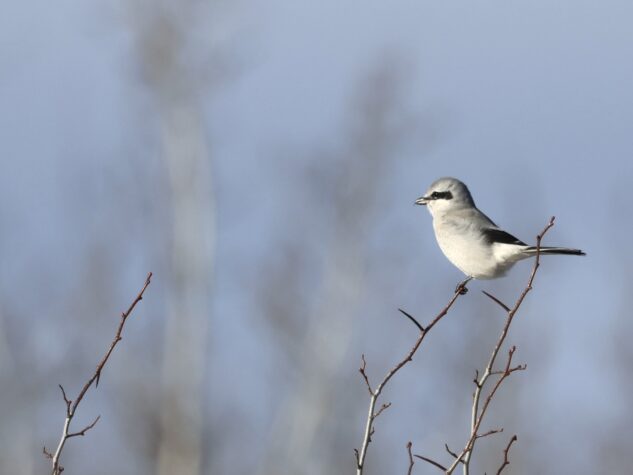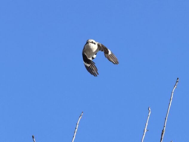 J’ai vu une pie-grièche boréale dans un petit arbre de ma cour en train de manger un viréo. J’ai des mangeoires pour un premier hiver, ce qui a pu l’attirer. C’est la première fois que j’en vois.