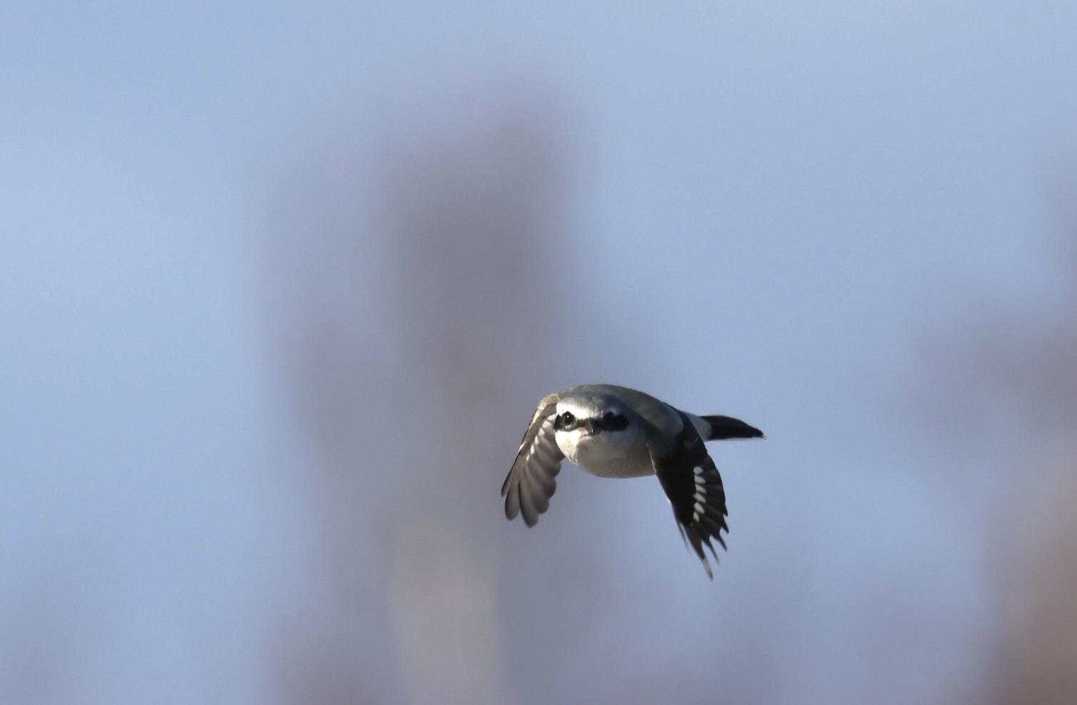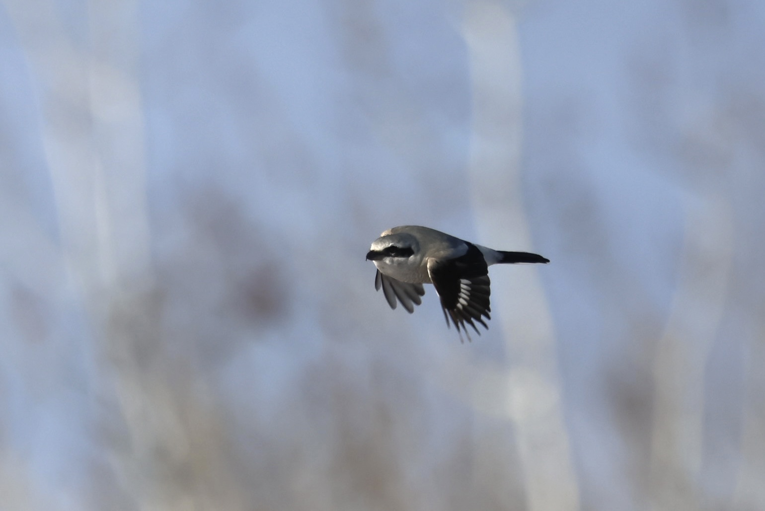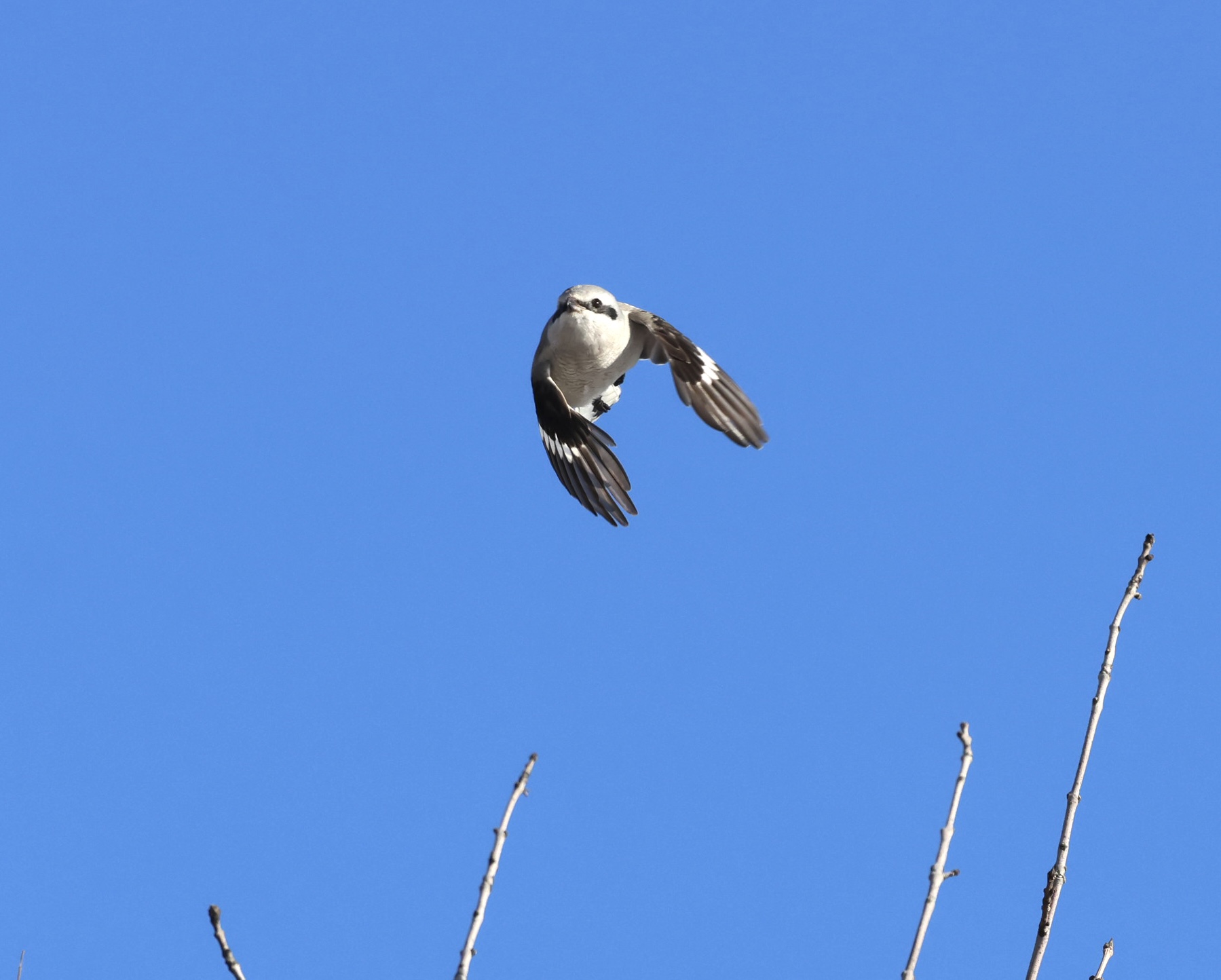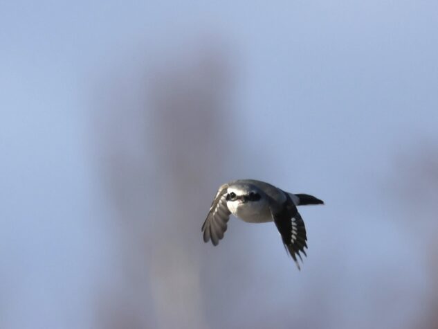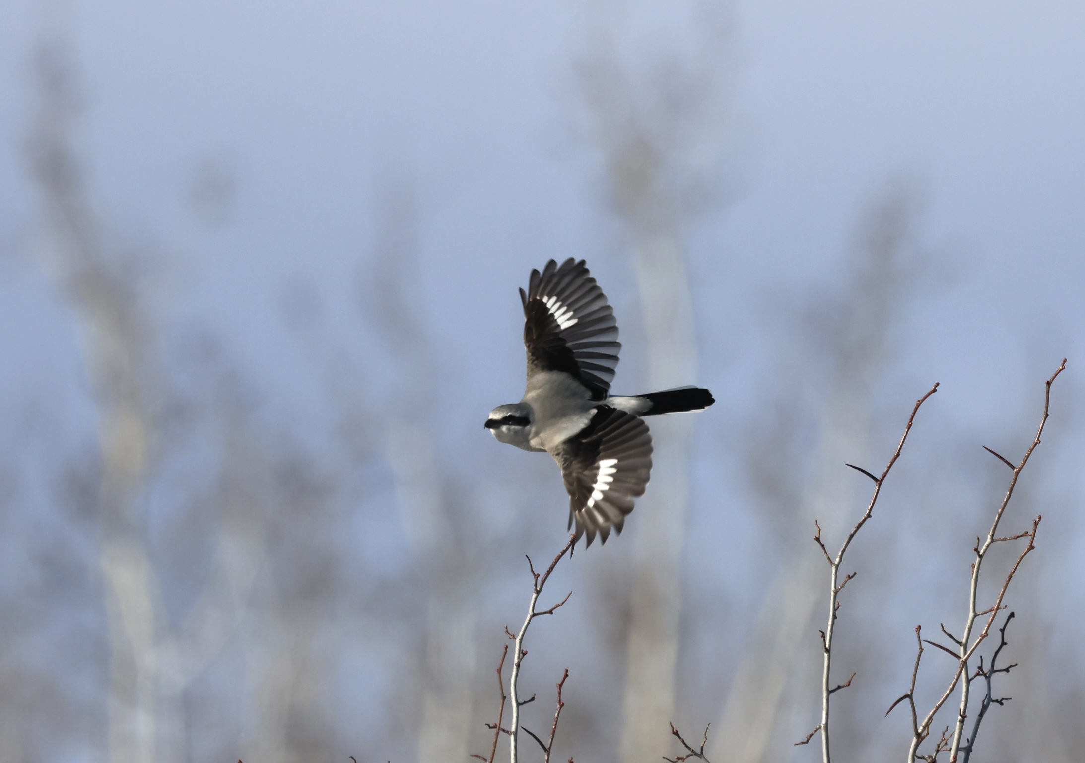 Pie-grièche boréale. C’est le cas de le dire qu’elle se tient en hauteur. Elle était très haute dans un arbre. S’est envolée dans un champ pour revenir dans le même arbre.